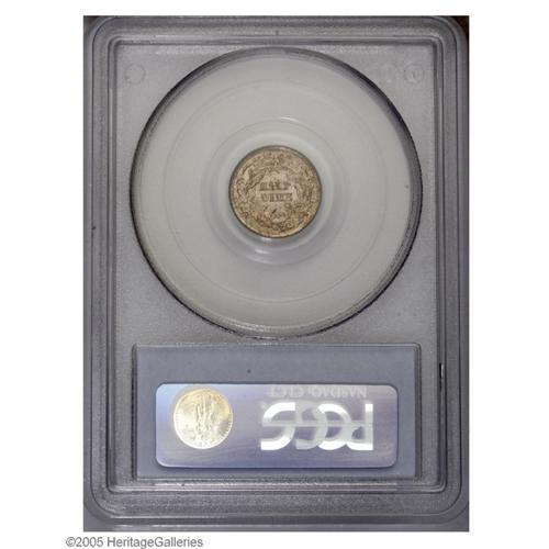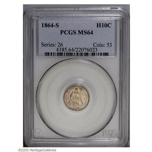 <B>1864-S<H10C> MS64 PCGS.</B></I> Medium pearl-gray and golden-brown toning blankets this lustrous and precisely struck near-Gem. The only detectable contact is beneath the ES in STATES. A better Civil War issue, the low production of 90,000 pieces was largely dissipated in circulation. Population: 6 in 64, 9 finer (9/05).