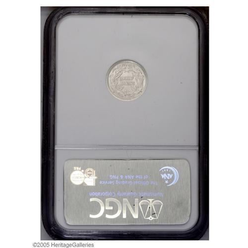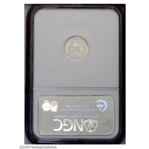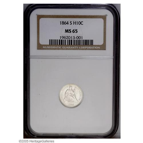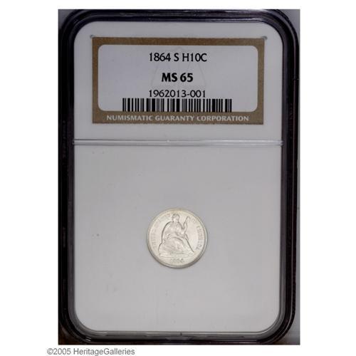 <B>1864-S<H10C> MS65 NGC.</B></I> A lustrous and essentially brilliant Gem. The strike is nearly full aside from the usually seen incompleteness on the upper left area of the wreath. Light clashmarks, as made, appear now and then in the fields, but the post-strike preservation is impeccable. This low mintage Dime would make a splendid addition to an advanced specialized set. Population: 7 in 65, 7 finer (9/05).