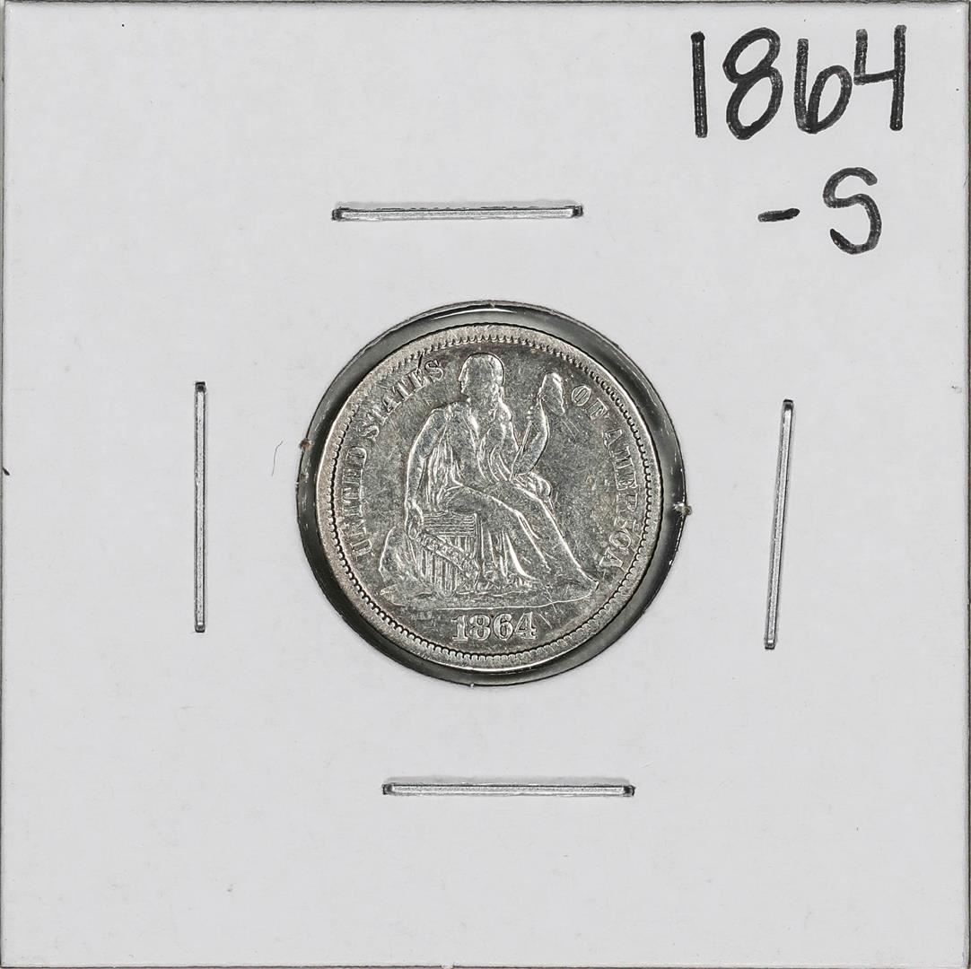One 1864-S Seated Liberty Dime Coin.