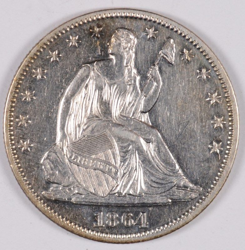 1864 SEATED HALF DOLLAR, MS-62, CIVIL WAR YEAR, VERY RARE DATE!