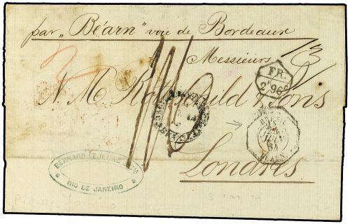 1864 Stampless envelope to LONDON written from RIO DE JANEIRO with circular datestamp sent on the French steamer "Bearn" via Bordeaux with octagonal French paquebot BRESIL BEARN datestamp (Salles 1009) and Anglo-French accountancy Fr2f96c (Van der Linden 1274) charged "1/6" in manuscript on arrival with LONDON back-stamp.