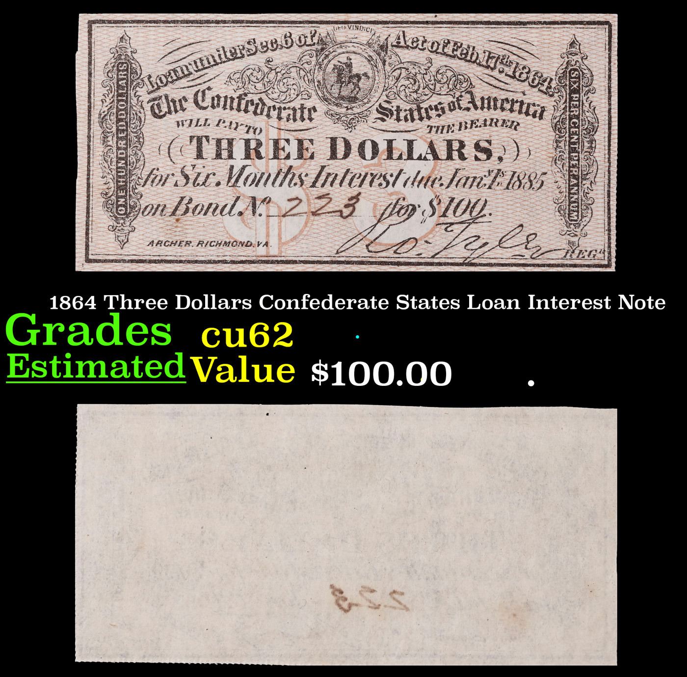 1864 Three Dollars Confederate States Loan Interest Note Grades Select CU. In order to fund their war effort, the newly formed Confederacy issued bonds to their citizens in 1861. These bonds included a series of coupons intended to be turned in individually for the periodic interest return on the bond, which are hand-numbered and hand-signed. These are a rare paper artifact of the Civil War.