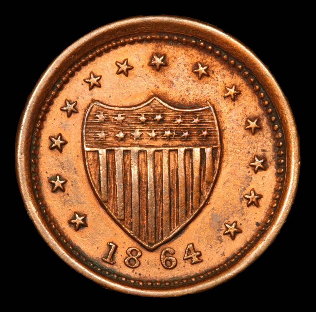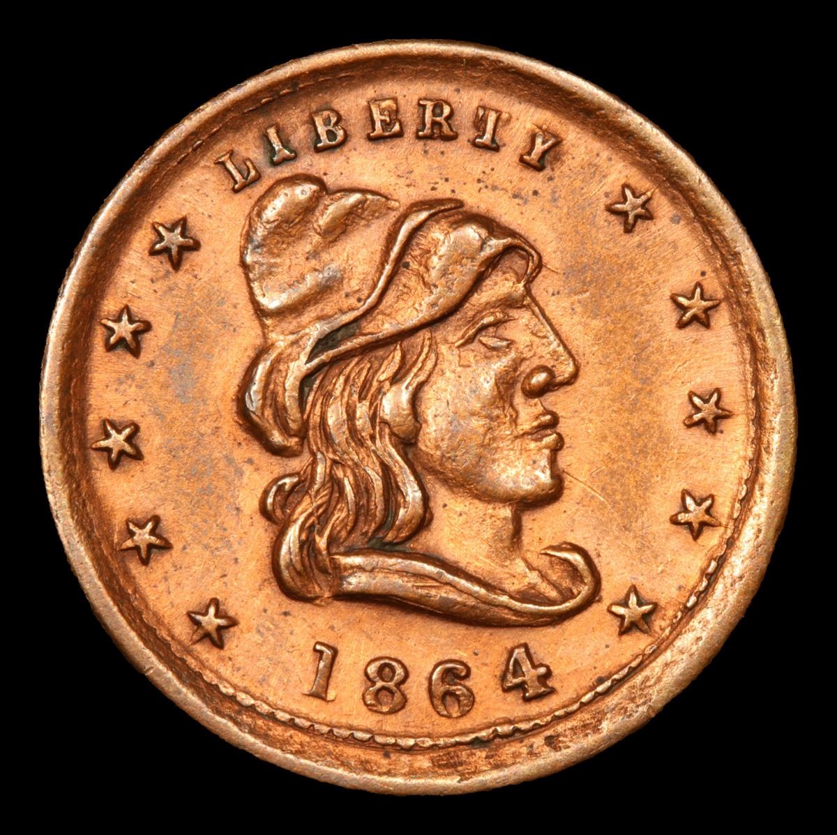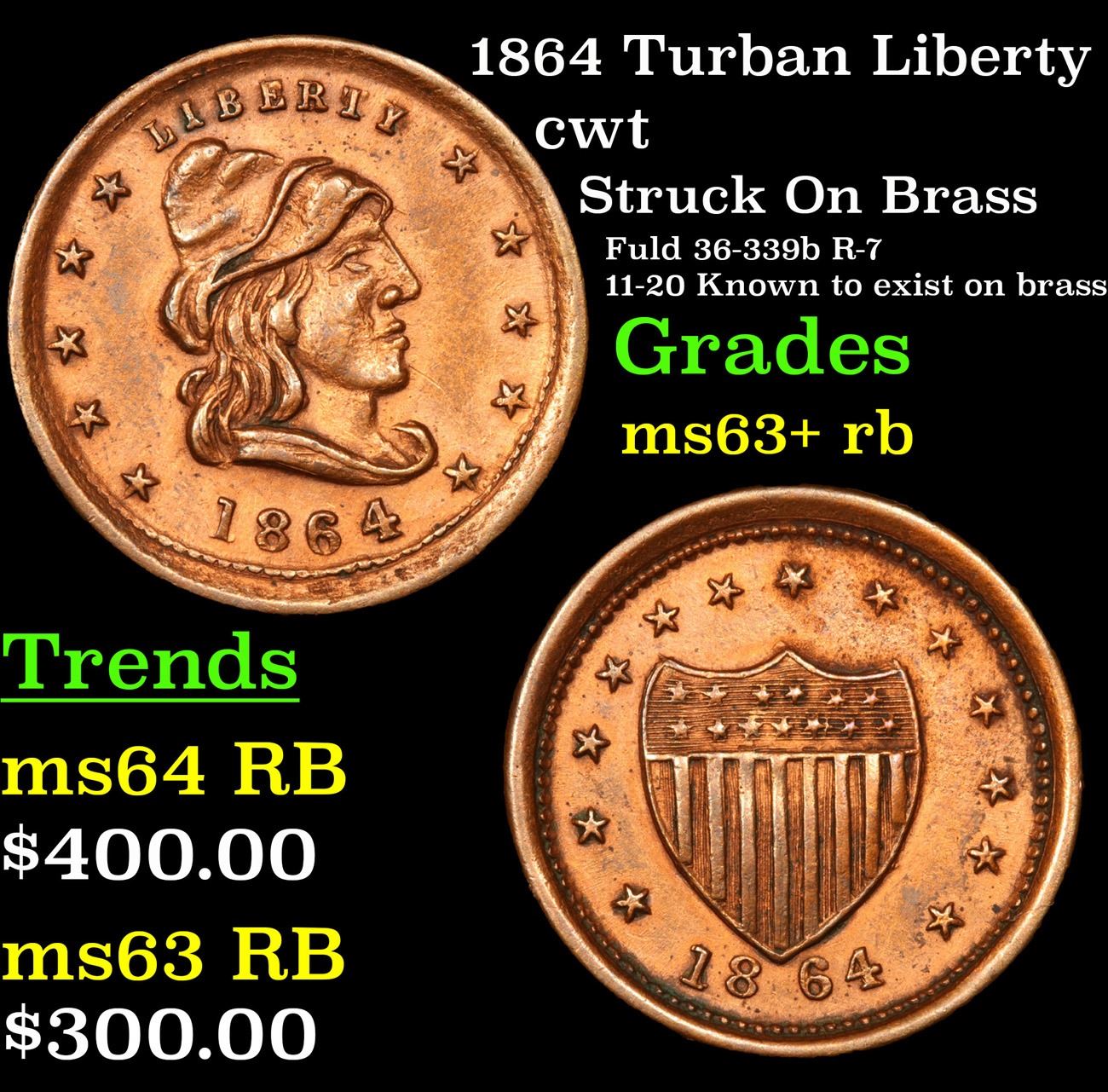 1864 Turban Liberty Struck On Brass Fuld 36-339b R-7 11-20 Known to exist on brass Civil War Token 1c Grades Select+ Unc RB. A Corey's Pick