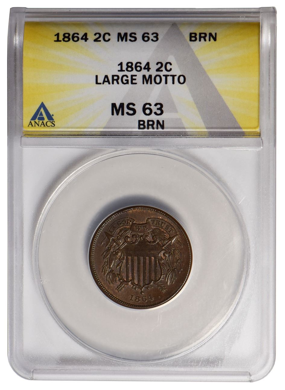 One 1864 Two Cent Large Moto ANACS MS63BN.