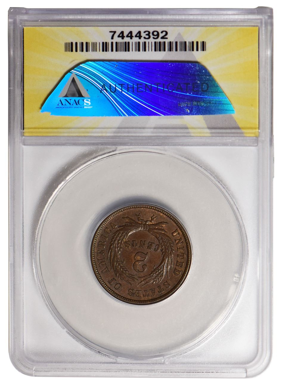One 1864 Two Cent Large Moto ANACS MS63BN.