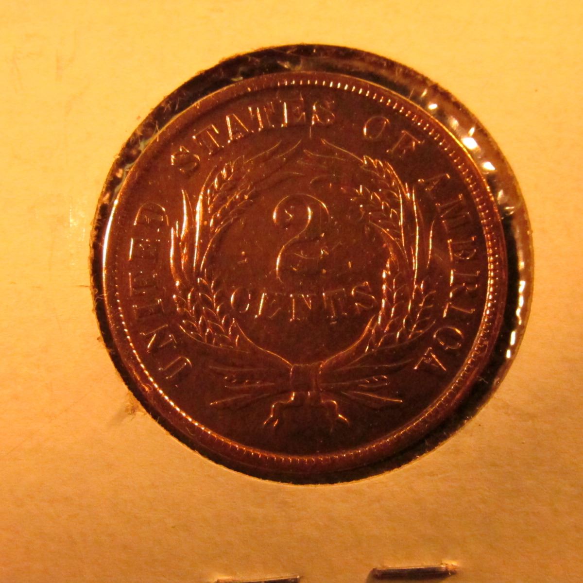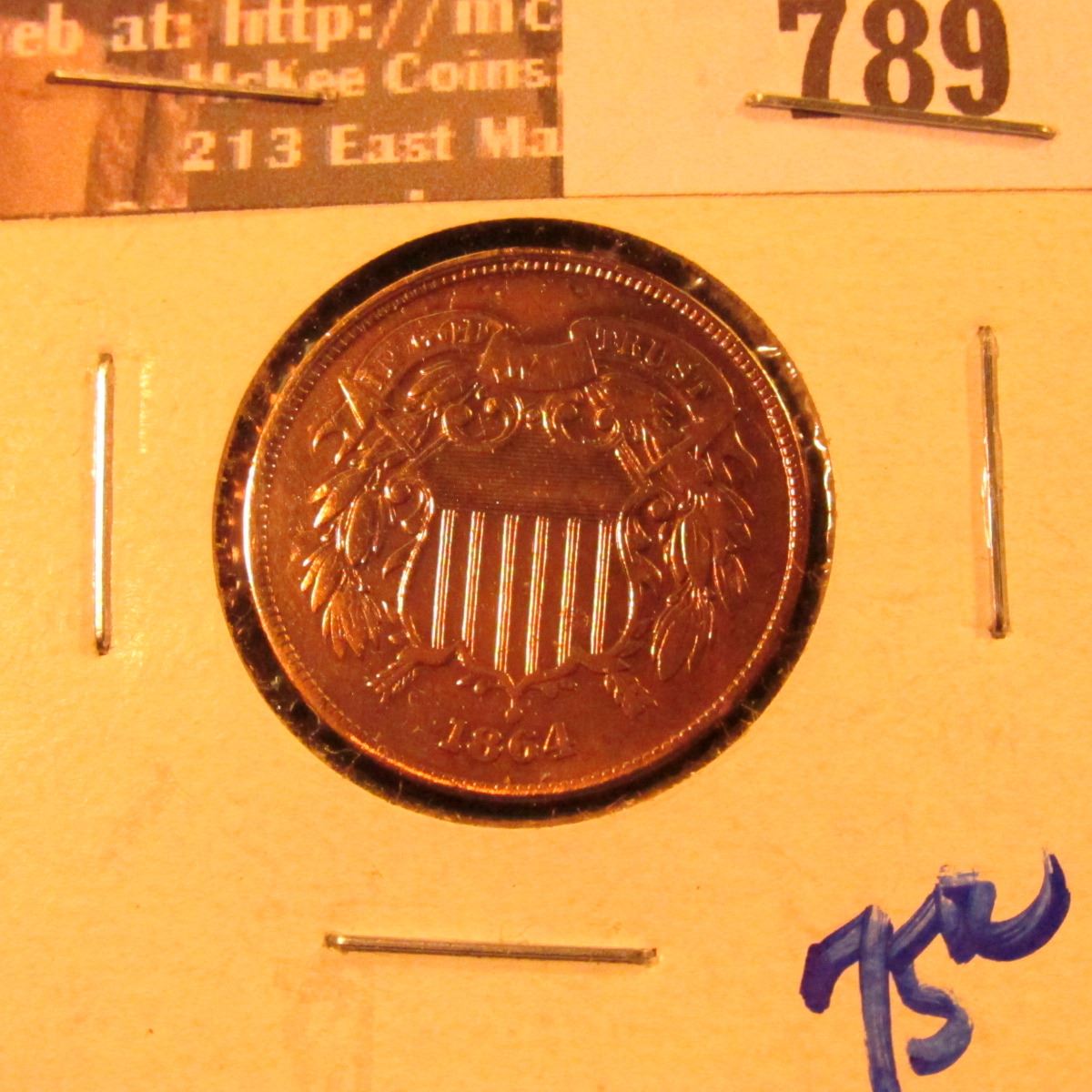 1864 Two Cent Piece, 180 degree die rotation. Lacquered and cleaned, but very nice grade.