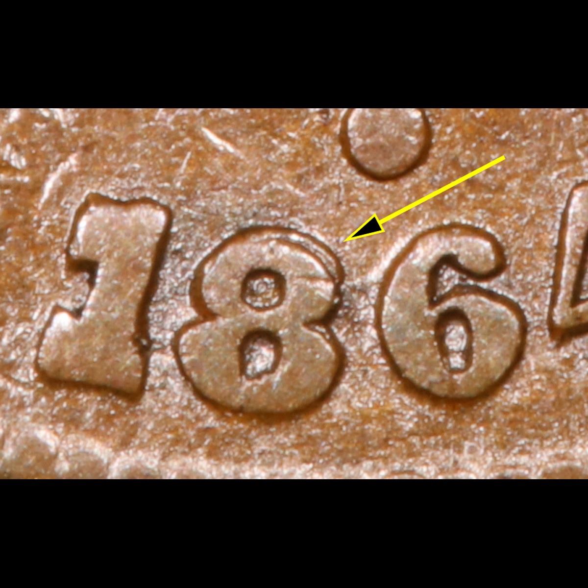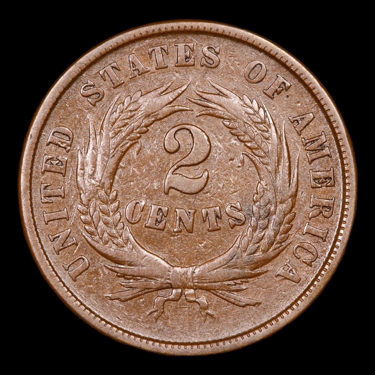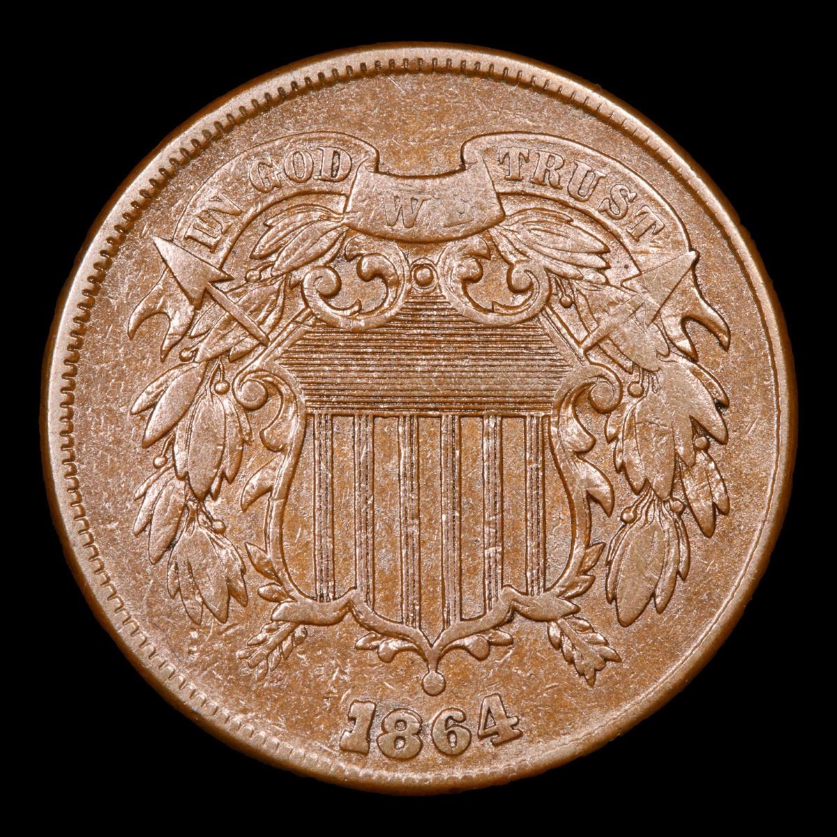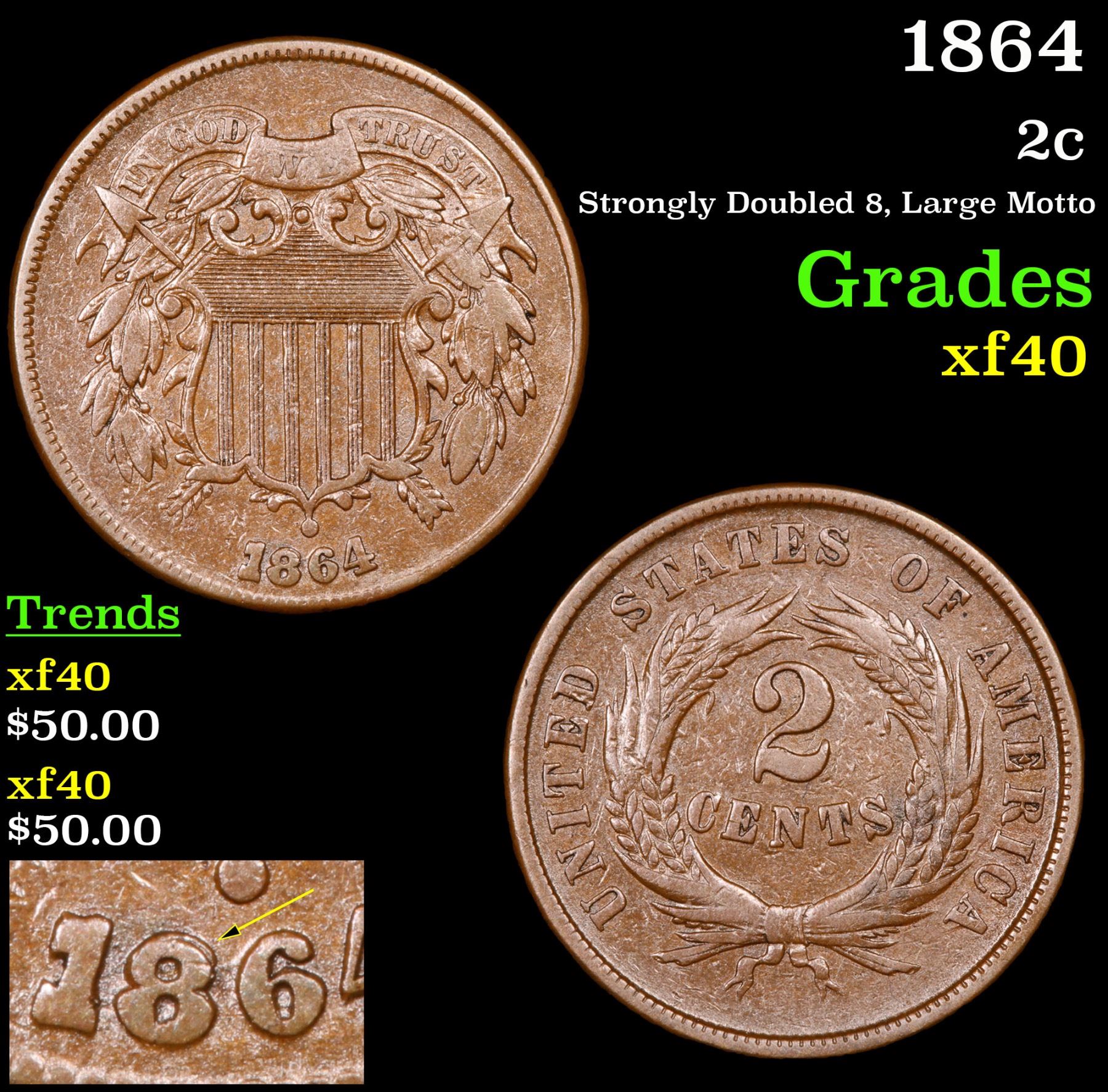 1864 Strongly Doubled 8, Large Motto . Two Cent Piece 2c Grades xf.