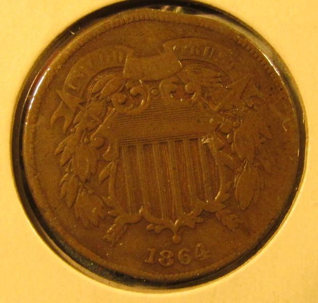 1864 Two Cent Piece, F, value $25