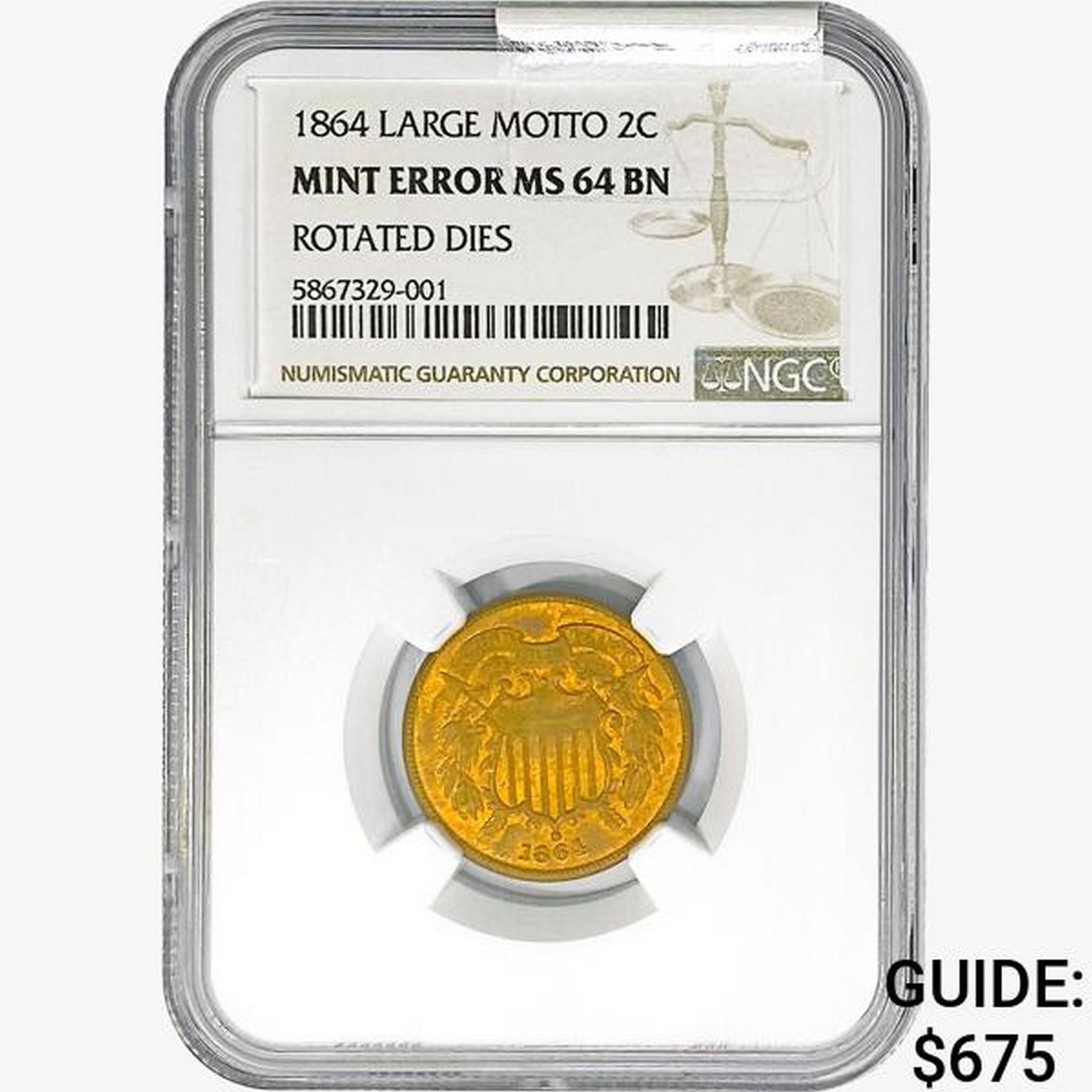 1864 Two Cent Piece NGC MS64 Lg Motto/Mint Err/Rot Dies