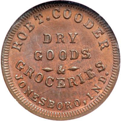 1864 US Civil War Storecard Token Indiana Fuld 495A-1A Rarity-6. NGC graded MS-65 Brown. Choice lustrous bluish steel and chocolate with 25% of the obverse showing faded mint red. A flawless gem example of the rare token from Robert Cooder of Jonesboro, Indiana, a merchant of "Dry Goods & Groceries". Valued at $800 in "unc" in the Rulau catalog. The attribution is noted on the NGC grading label.