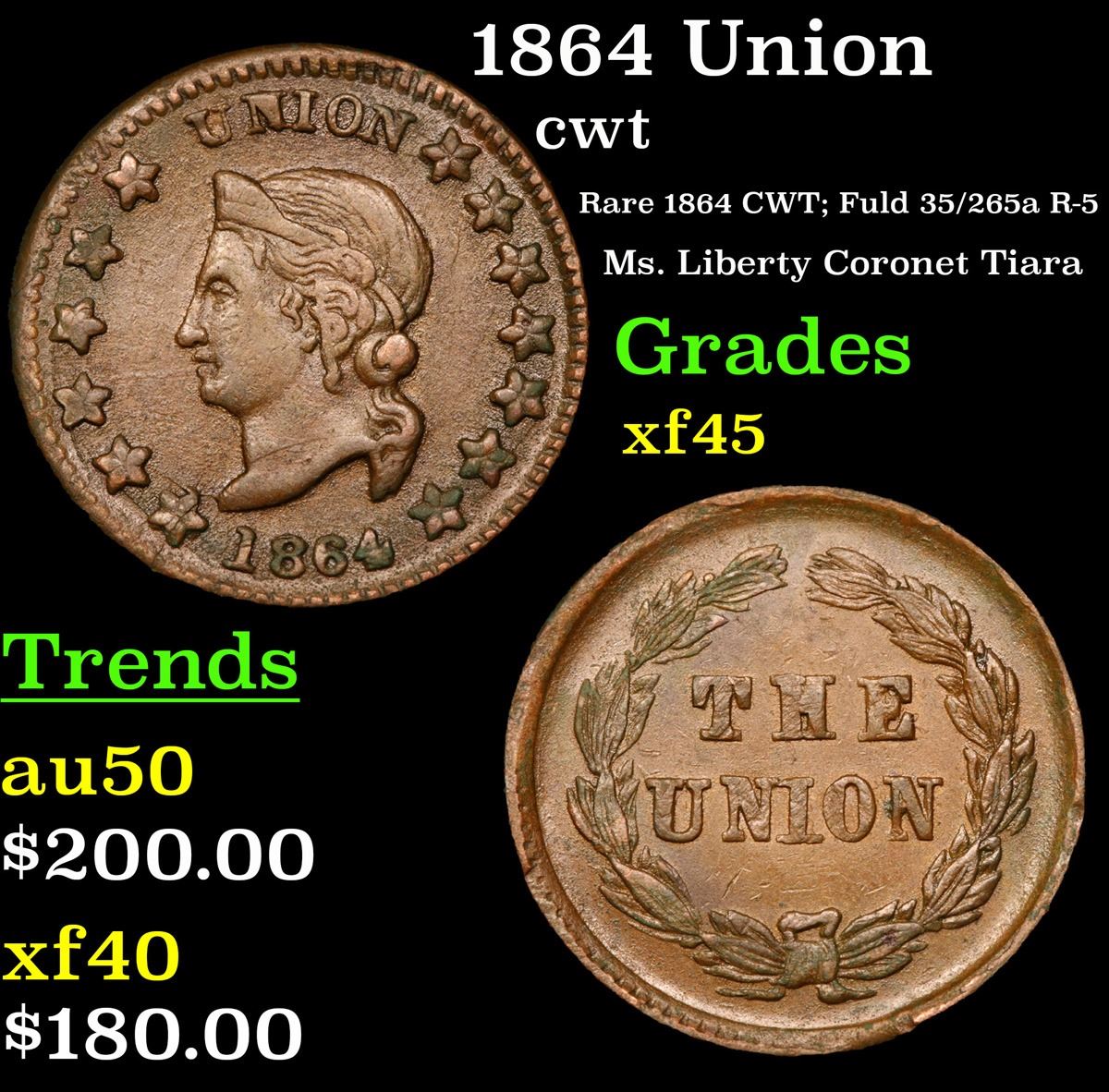 1864 Union Rare 1864 CWT; Fuld 35/265a R-5 Ms. Liberty Coronet Tiara Civil War Token 1c Grades xf+.