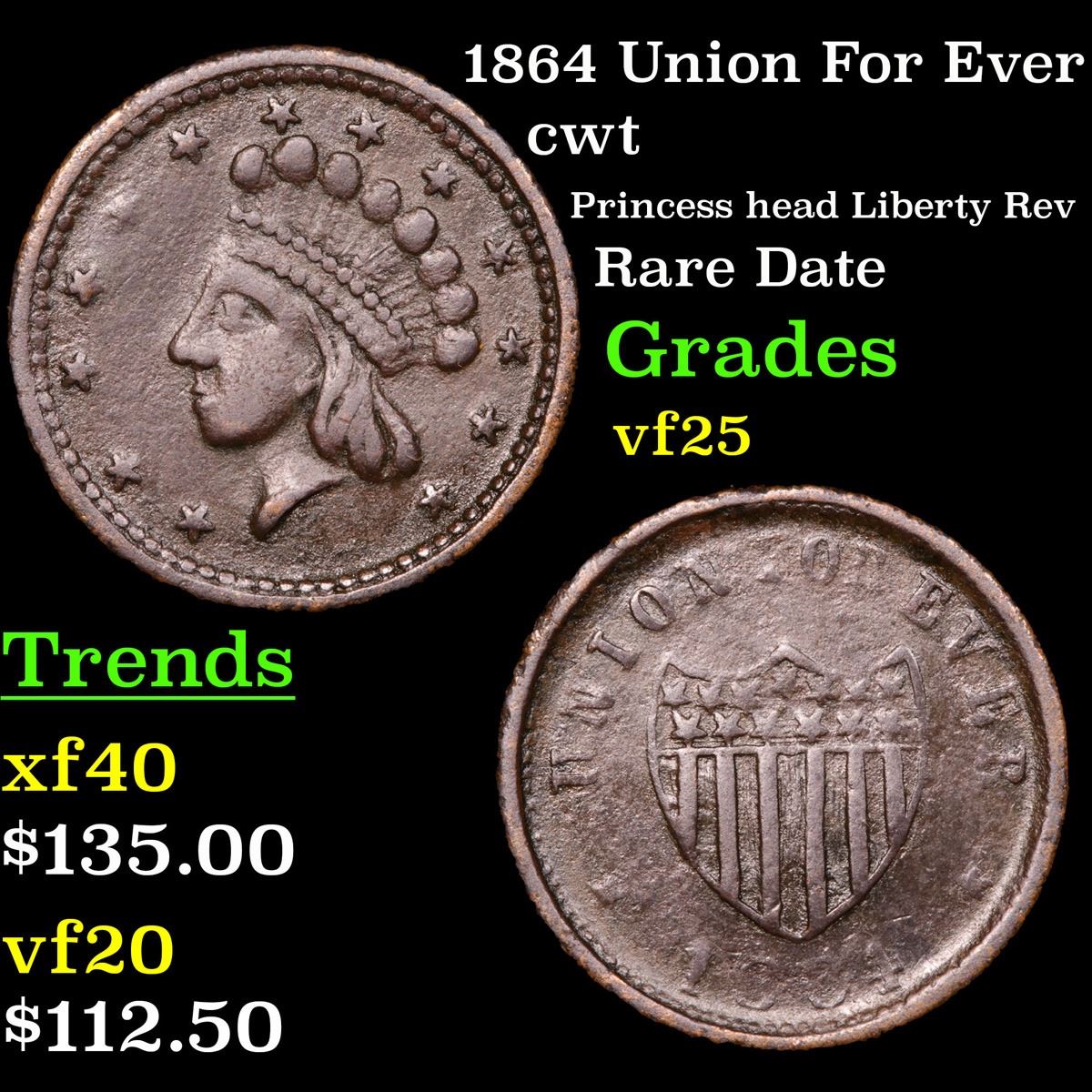 1864 Union For Ever Princess head Liberty Rev Rare Date Civil War Token 1c Grades vf+.