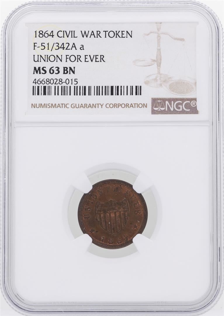 One 1864 Union For Ever Civil War Token NGC MS63BN. NGC Certified.