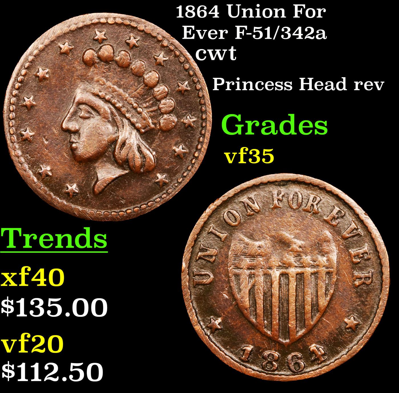 1864 Union For Ever F-51/342a Civil War Token 1c Grades vf++. Obverse: Union For Ever Reverse: Princess head