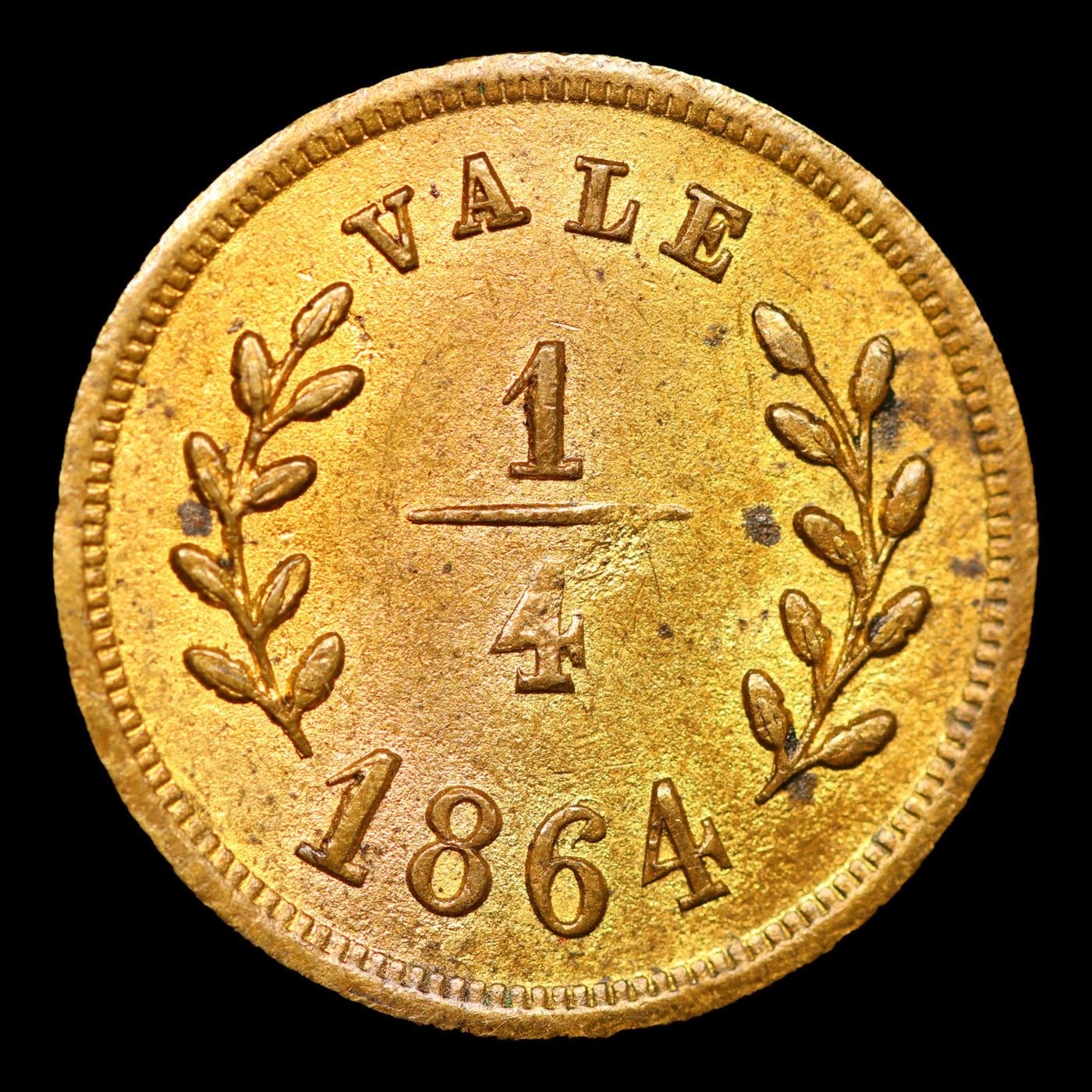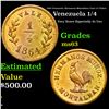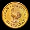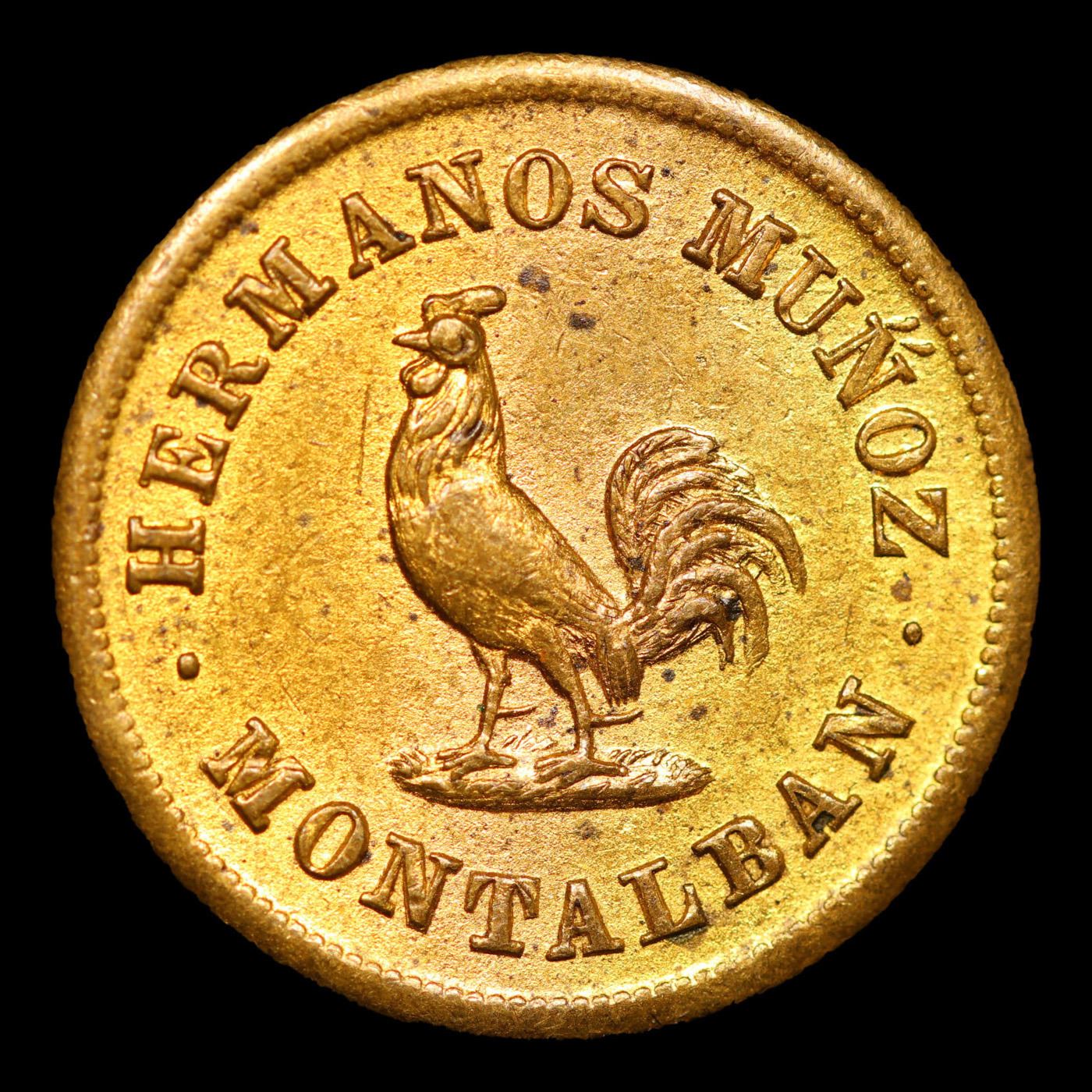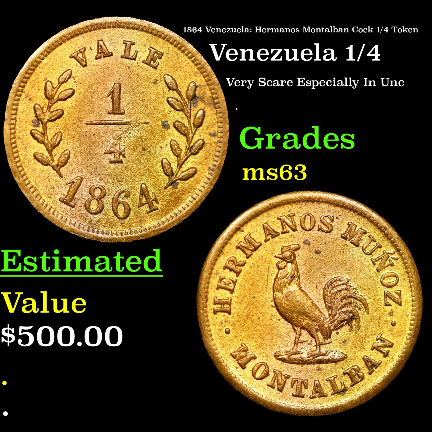 1864 Venezuela: Hermanos Montalban Cock 1/4 Token Grades Select Unc. Rulau - CBO18 Brass 1/4 Reel Token 1864 in Unc condition. One of the "Classic Rarities" among the tokens of Latin America. Measures about 18mm and depicts a rooster with the legend, "Hermanos Munoz Montalban."