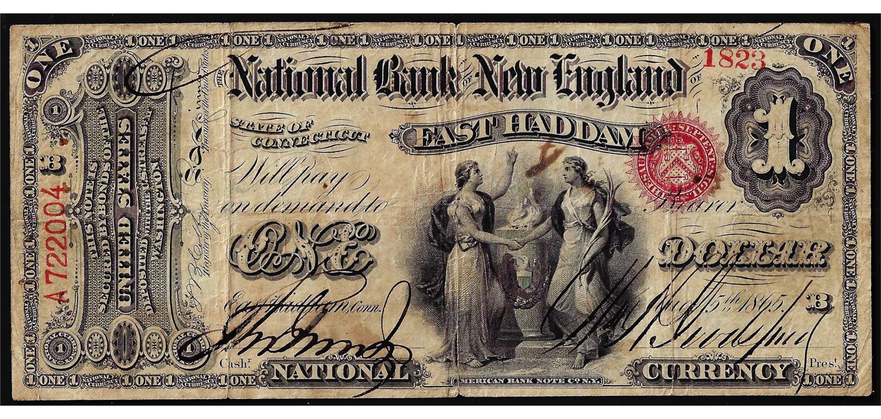 One 1865 $1 National Bank of New-England East Haddam, CT CH# 1480 National Currency Note.