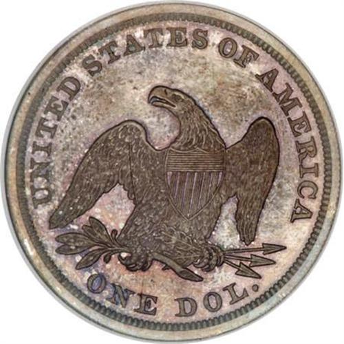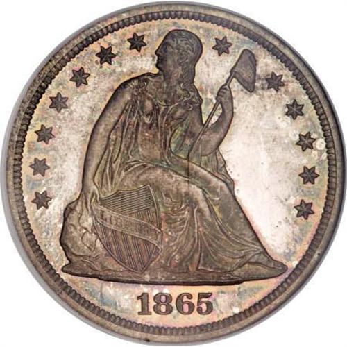 <B>1865 $1 PR65 NGC.</B></I> The 1865 is one of those Seated dollar issues sure to elicit spirited bidding--especially a lovely Gem such as the present specimen. The mintage of business strikes for this final year of the Civil War was quite low to begin with--46,500 coins--and most of them appear to have been exported to Latin America. Mint State business strikes are accordingly extremely rare, exerting added upward price pressure on the few proofs produced, 500 to be precise. <BR> As of (3/08) NGC has certified 27 Gem proof examples of this date, with 17 finer (finest a PR68!), less the usual suspect quantities to allow for resubmissions and the like.<BR> The fields on this proof are extraordinarily deep in their mirrored reflectivity, an attribute that is even more surprising when one sees the mottled gray and blue toning that covers most of each side. Pinpoint striking details are seen on this lovely Gem, and there are no noticeable contact marks on either side.<BR><I>From The Queller Family Collection of Silver Dollars.</B></I><BR><BR><B>Coin Engraver:</B> Christian Gobrecht<BR><BR><b>Shipping:</b> Coins & Currency (<a target="_blank" href="http://www.heritageauctions.com/common/shipping.php">view shipping information</a>)