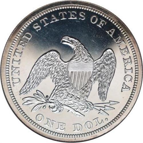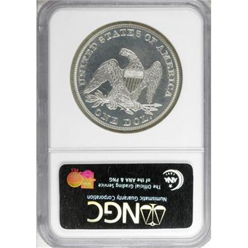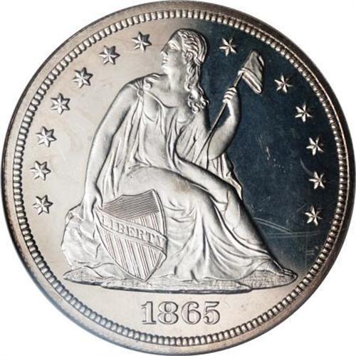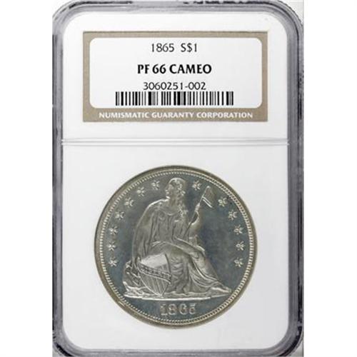 <B>1865 $1 PR66 Cameo NGC.</B></I> The excessively rare and likely clandestine 1866 specimens notwithstanding, the 1865 silver dollar proofs are the last of the No Motto type for that denomination. The mintage of 500 pieces, like the production figures from 1862 on, shows a steep drop from the highs encountered in 1860 and 1861, which both boasted four-figure mintages for their respective proof issues.<BR> This pleasingly preserved and elegant survivor offers exceptional visual appeal. Though thin silver-gray haze drapes much of the fields, considerable reflectivity shines through, and the contrast with the moderately frosted devices is prominent and undeniable. Subtle golden toning visits the margins, and a tiny lintmark to the left of Liberty's arm can serve as a pedigree marker. A delightful and important survivor. Census: 5 in 66 Cameo, 1 finer (11/07).<BR><BR><b>Shipping:</b> Coins & Currency (<a target="_blank" href="http://www.heritageauctions.com/common/shipping.php">view shipping information</a>)