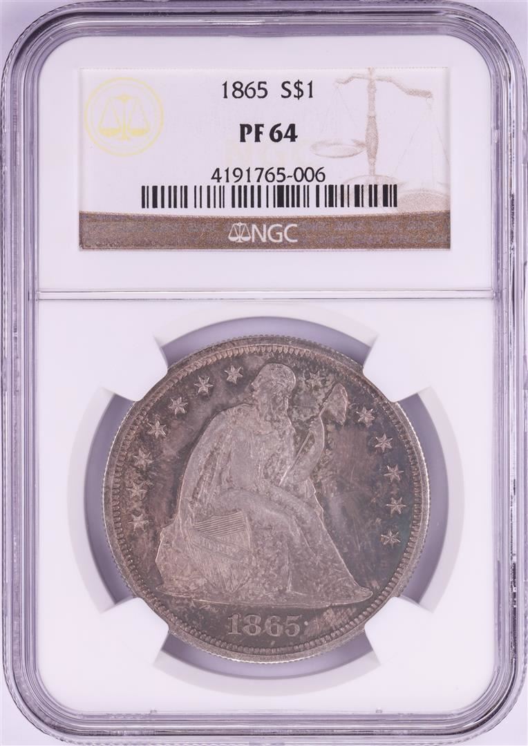 One 1865 $1 Proof Seated Liberty Silver Dollar Coin NGC PF64. NGC Certified.