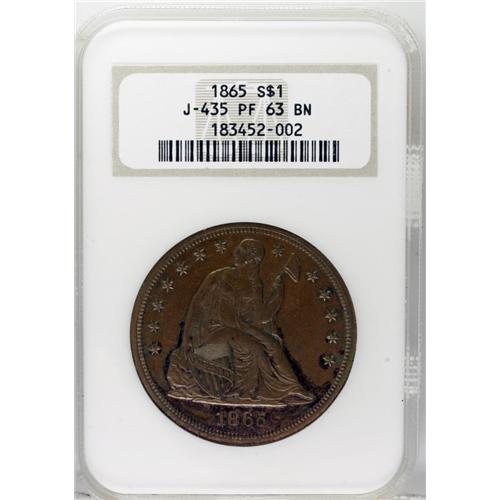 <B>1865 $1 Seated Liberty Dollar, Judd-435, Pollock-508, Low R.7, PR63 Brown NGC.</B></I> The regular issue With Motto Seated Liberty dollar design. Struck in copper with a reeded edge. About 10 to 12 examples of this Judd number are known in various degrees of preservation. Like many other pattern pieces dated in the mid-1860s, this variety is considered a restrike or novodel coined in the late 1860s or early 1870s. Walter Breen claims that this pattern is from the same reverse die used to coin the last 1866 and first 1867 proof Seated dollars. This commentary might help to establish when these pieces were struck, although it is important to remember that the die might have been used to coin patterns first, and also that the reverse die may have been used in several later years. This lightly mirrored piece has distinctive olive coloration with splashes of blue toning and limited pale orange color on the obverse.<BR><I>From The Jones Beach Collection.</B></I><BR><BR><b>Shipping:</b> Coin/Currency (<a target="_blank" href="http://www.heritageauctions.com/common/shipping.php">view shipping information</a>)