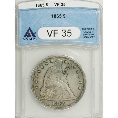 <B>1865 $1 VF35 ANACS.</B></I> NGC Census: (2/47). PCGS Population (4/83). Mintage: 46,500. Numismedia Wsl. Price: $454. (#6955)<BR><BR><b>Shipping:</b> Coins & Currency (<a target="_blank" href="http://www.heritageauctions.com/common/shipping.php">view shipping information</a>)