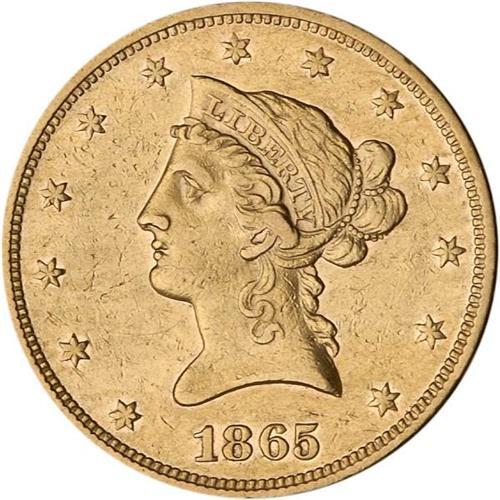 <b>1865 $10 Liberty. Net MS60.</b> At one time lightly cleaned. Splendid yellow gold luster on both sides. A major rarity in business strike form, one of just 3,980 struck. David Akers suggests that the typically encountered piece is only VF-30! An important opportunity for the connoisseur and specialist to acquire a full-fledged Mint State <b>(PCGS # 8641)</b> <i>