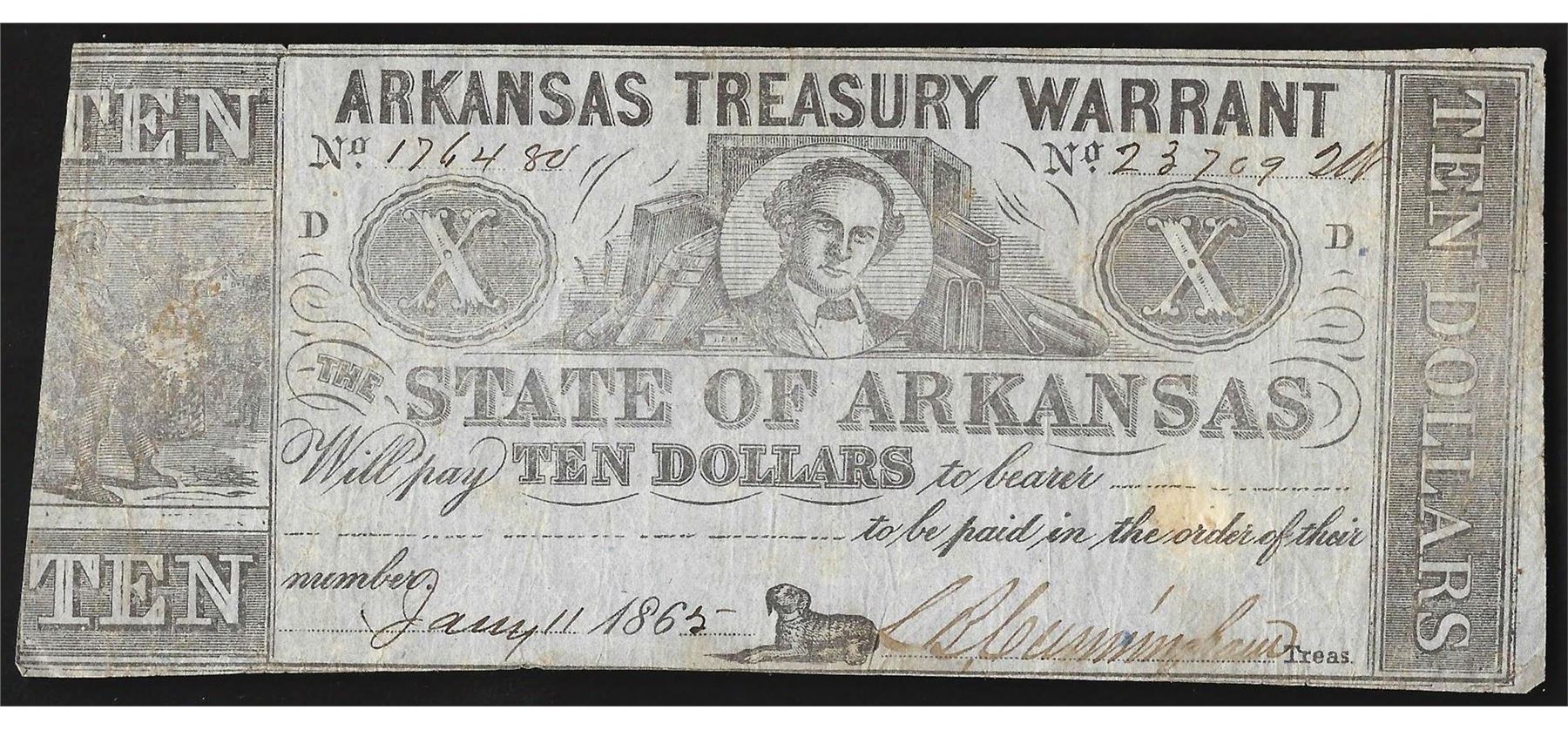 One 1865 $10 State of Arkansas Treasury Warrant Note.