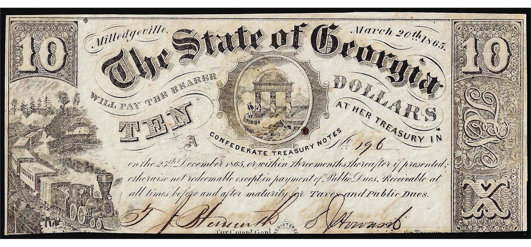 1865 $10 State of Georgia Milledgeville, GA Obsolete Note