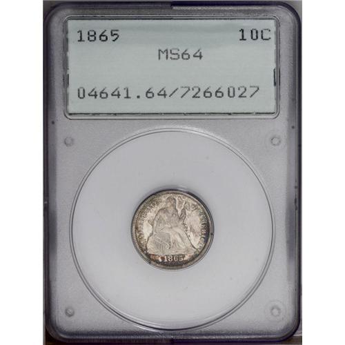 <B>1865<10C> MS64 PCGS.</B></I> A moderately prooflike near-Gem with pleasing surfaces and only slight striking softness on the lower edges of the wreath. A mere 10,000 pieces were struck, since fractional currency drove out specie. In a first generation holder. Population: 4 in 64, 6 finer (1/06).