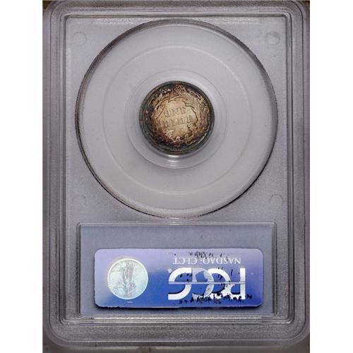 <B>1865<10C> MS66 PCGS.</B></I> The 1865 dime, with a business strike mintage of 10,500 pieces, is quite scarce in any grade. Only 55 or so Mint State examples have been certified by PCGS and NGC. The Premium Gem specimen offered in this lot displays electric-blue toning around the peripheries, and then transitions into lavender and golden-brown. The design elements are sharply struck, and the lustrous surfaces are devoid of significant marks. Population: 3 in 66, 2 finer (4/06).