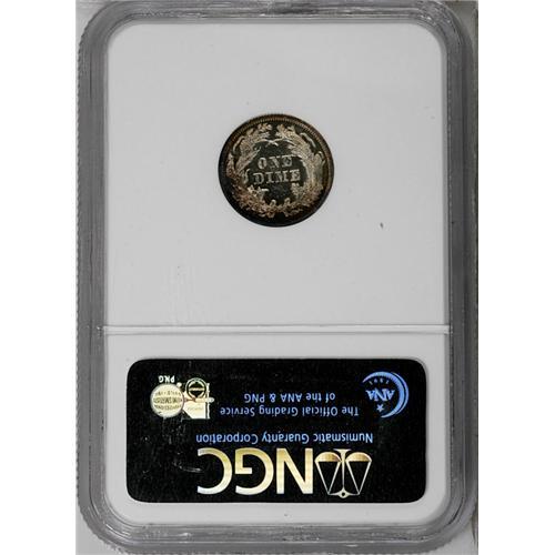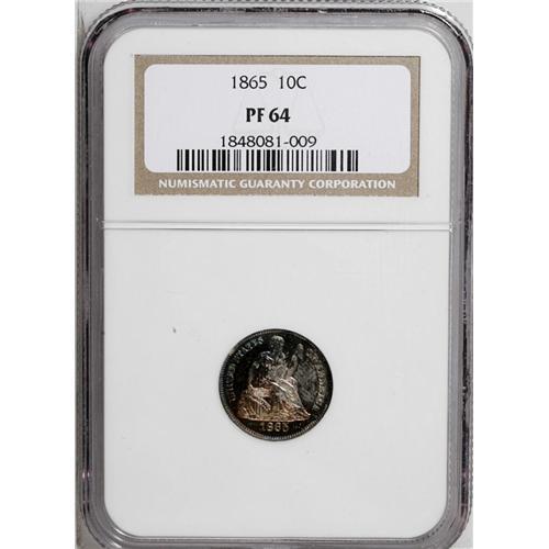 <B>1865<10C> PR64 NGC.</B></I> Electric blue and magenta are dominant in this spectrum-ranging proof with moderate mirrors. A small patch of hairlines in the right obverse field limits the grade, though not the eye appeal.<BR><I>Ex: John L. Harris Collection (Stack's, 11/50), lot 345.</B></I><BR><I>From The Redfjord Collection.</B></I>