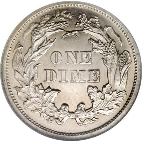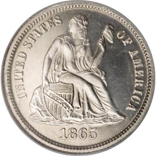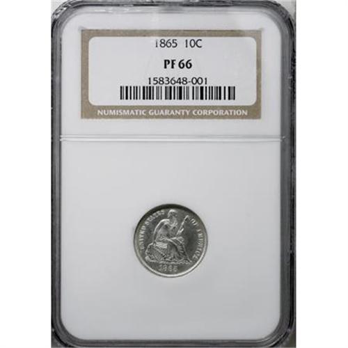 <B>1865 10C PR66 NGC.</B></I> The white on black contrast is blatant, but the present brilliant Premium Gem is undesignated as Cameo. Exquisitely struck and unabraded with a few inconsequential lint marks, as produced. This Civil War date has a low proof mintage of 500 pieces. Census: 7 in 66, 2 finer (11/07).<BR><BR><B>Coin Engraver:</B> Christian Gobrecht<BR><BR><b>Shipping:</b> Coins & Currency (<a target="_blank" href="http://www.heritageauctions.com/common/shipping.php">view shipping information</a>)