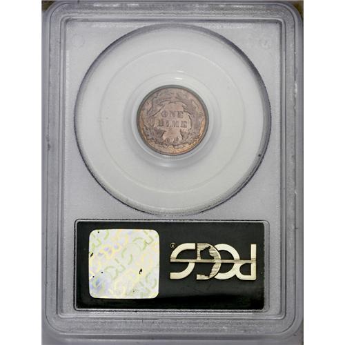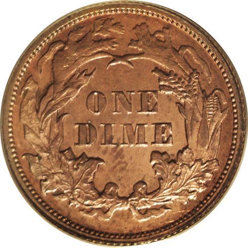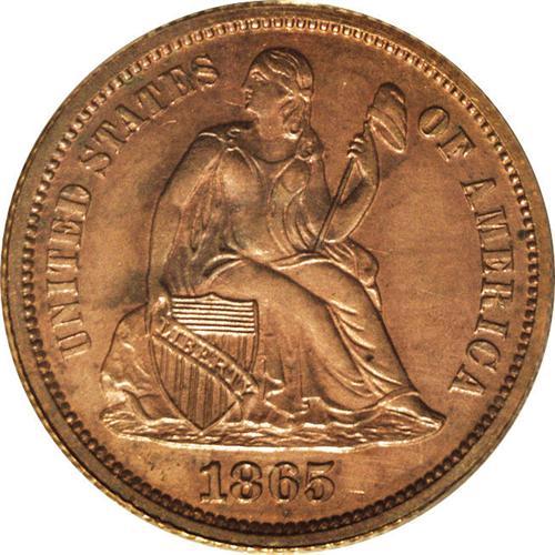 <B>1865<10C> Ten Cents, Judd-421, Pollock-493, High R.7, PR62 Red and Brown PCGS.</B></I> This extremely rare dies trial piece is struck from regular issue Seated Liberty dime dies, but in copper with a reeded edge. Orange-gold borders accompany salmon-pink fields and devices. A dark blue area encompasses portions of Liberty's waist. The top of the wreath is softly defined, although the strike is penetrating elsewhere. Encapsulated in an old green label holder.