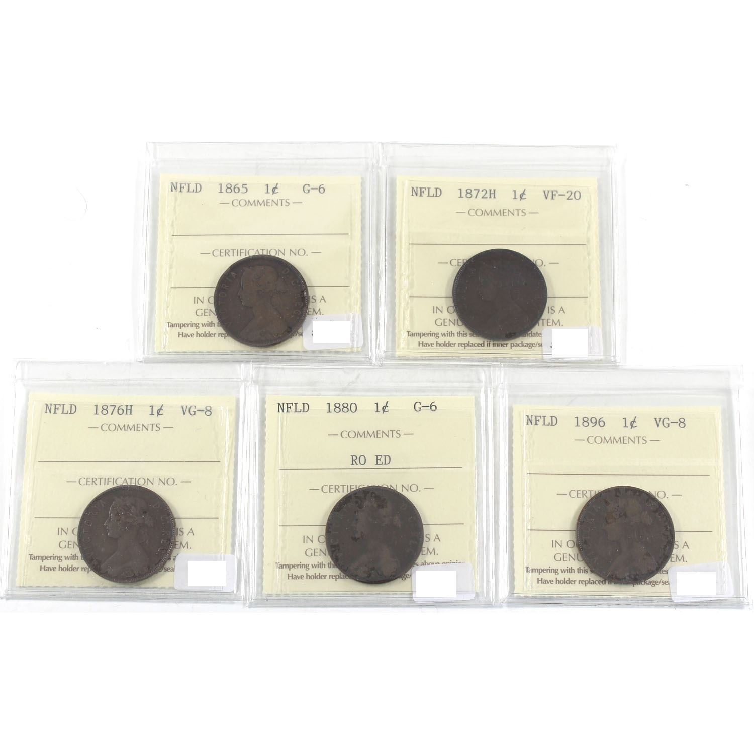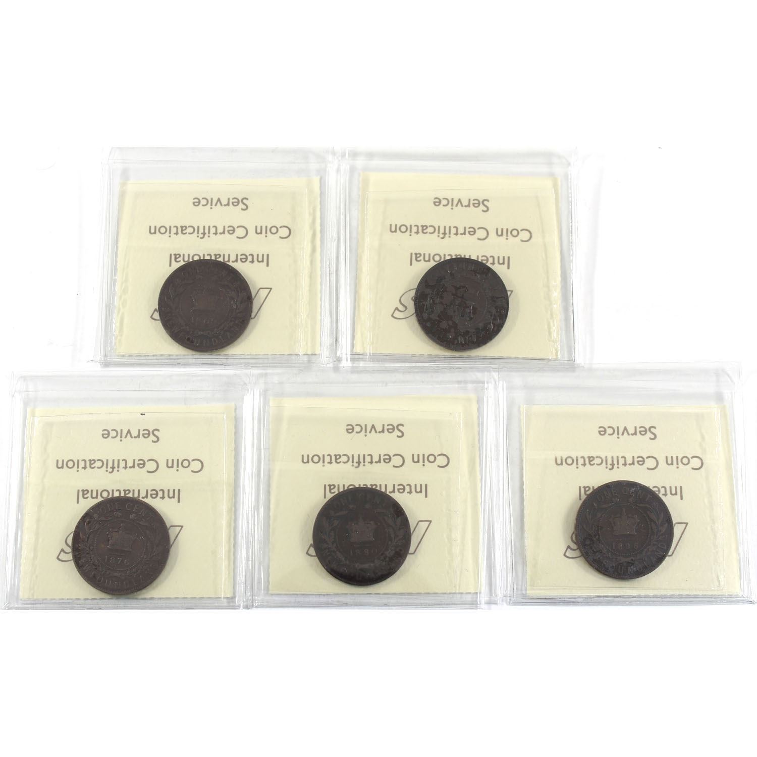 1865-1896 Newfoundland 1-cent ICCS Certified - 1865 G-6, 1872H VF-20, 1876H VG-8, 1880 RO ED G-6 & 1896 VG-8. 5pcs