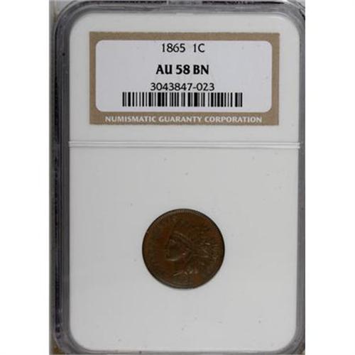 <B>1865 1C Fancy 5 AU58 NGC.</B></I> NGC Census: (15/200). PCGS Population (27/81). Mintage: 35,429,288. Numismedia Wsl. Price for NGC/PCGS coin in AU58: $55. (#2082)<BR><BR><B>Coin Engraver:</B> James B. Longacre<BR><BR><b>Shipping:</b> Coins & Currency (<a target="_blank" href="http://www.heritageauctions.com/common/shipping.php">view shipping information</a>)