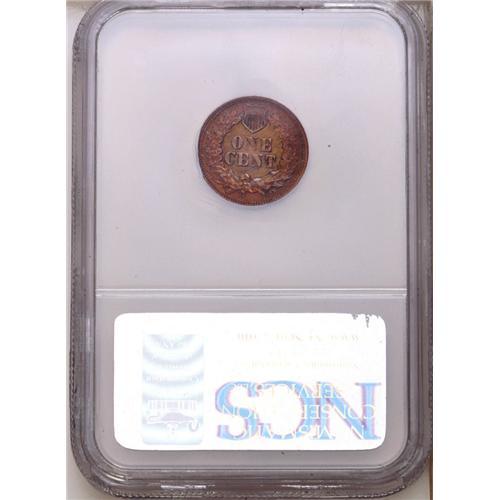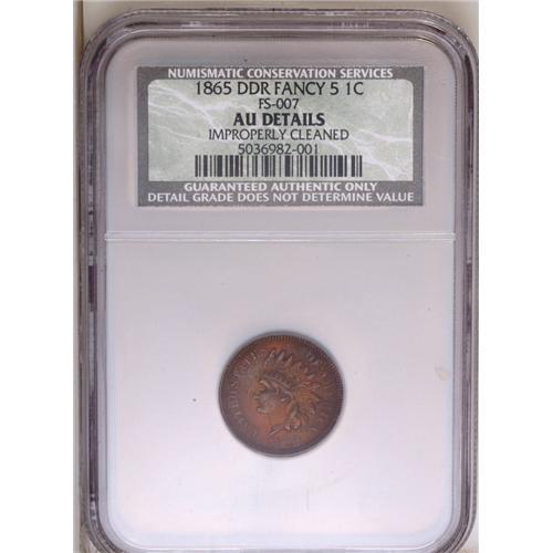 <B>1865<1C> Fancy 5--Doubled Die Reverse, Improperly Cleaned--NCS. AU Details.</B></I> FS-007, Snow-2b. ONE CENT and other reverse elements are strongly die doubled with a western spread. This piece is recolored in orange and olive hues. The date and right obverse border are softly impressed.