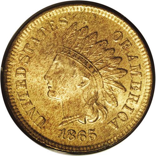 <B>1865<1C> Fancy 5 MS65 Red PCGS.</B></I> Boldly struck throughout, the highly lustrous surfaces are a pretty golden-tan color with a slight overlay of speckled reddish patina on each side. Surface marks are essentially absent. Seldom located in Gem condition. Housed in a first-generation PCGS holder. Population: 40 in 65, 10 finer (9/06).