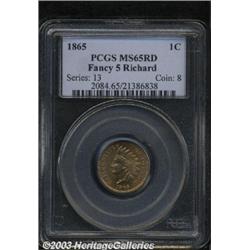 1865 1C Fancy 5 MS65 Red PCGS. This beautiful Gem is brightly colored in honey-gold luster. Uncommonly sharp for the type, the surfaces are free of noticeable abrasions. There are clashmarks (as struck) in the reverse field, and a virtual freedom of carbon spots.From the Richard Collection. Important notice: Heritage usually auctions material at the rate of 200-250 lots per hour. On some occasions eBay Live bid software or the Internet may not be able to keep up with the pace of the auction. We recommend placing a realistic absentee bid now as insurance to avoid disappointment. Occasionally the auctioneer may eliminate or reject an eBay Live bid, and the auctioneer may also reopen a lot after the close of the eBay live bidding (usually because we missed an audience bid), and may reject your bid even if it shows you as the winning bidder. By bidding via eBay Live, you agree that Heritage may award the lot to another bidder at its sole discretion under the circumstances described above or any other reasonable circumstances. Also please note that all Heritage lots purchased through eBay Live carry a 20% Buyer's Premium. Please make sure you read the Terms and Conditions before you bid.