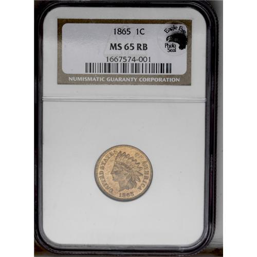 <B>1865<1C> Fancy 5 MS65 Red and Brown NGC.</B></I> An Eagle Eye Photo Seal sticker is attached to the holder. This Gem has bright orange color on both sides, with some mellow brown toning on each side. Although not possessing full red mint color, it nearly qualifies as a red example.