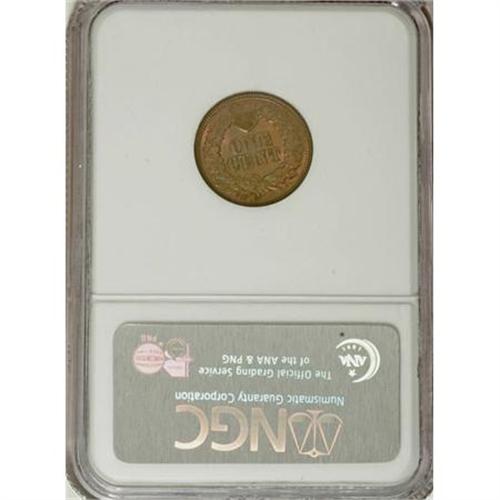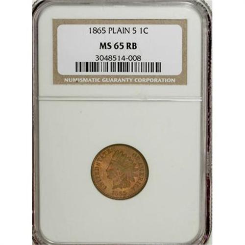 <B>1865 1C Plain 5 MS65 Red and Brown NGC.</B></I> Fully struck with intense, shimmering luster and beautifully deep golden-bronze and purple-violet coloration. A pair of small die lumps are noted on Liberty's neck. Both side of the piece are free of grade-limiting distractions. Census: 3 in 65 Red and Brown, 0 finer (8/07). <BR><BR><b>Shipping:</b> Coins & Currency (<a target="_blank" href="http://www.heritageauctions.com/common/shipping.php">view shipping information</a>)