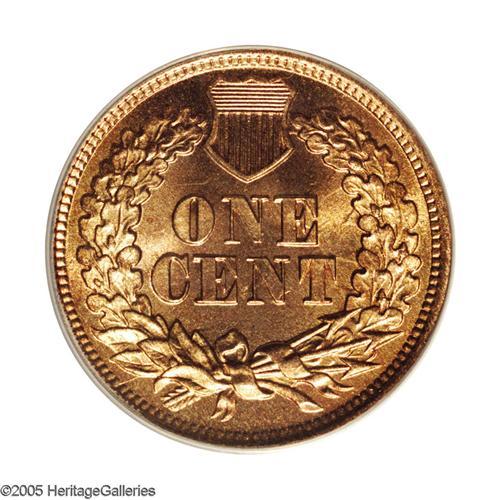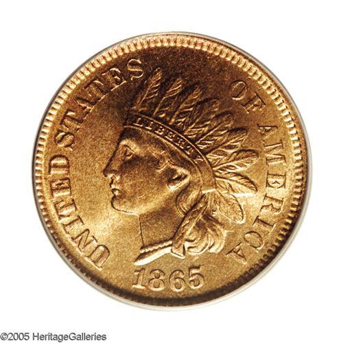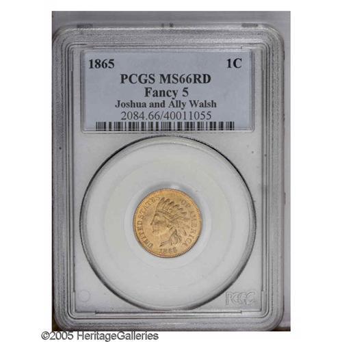 <B>1865<1C> Fancy 5 MS66 Red PCGS.</B></I> Ex: Ally Collection. Both sides of this lovely premium Gem are awash in frosty textured luster that possesses an undisturbed, golden-orange sheen. As befits the MS66 grade level, the surfaces are free of all but a few trivial blemishes. Clashmarks are seen in the fields, particularly on the reverse around the denomination ONE CENT. Conditionally rare as a date. Population: 9 in 66, none are finer at either service (11/05).<BR><I>From The Joshua and Ally Walsh Collection of United States Cents.</B></I>