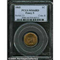 <B>1865<1C> Fancy 5 MS66 Red PCGS.</B></I> The present Gem is awash in rich, reddish-orange luster. Both the obverse and the reverse display ample evidence of a powerful impression, and the satiny textured surfaces show only a few small flecks of carbon. Conditionally scarce. <BR><BR><B>Important notice:</B> Heritage usually auctions material at the rate of 200-250 lots per hour. On some occasions eBay Live bid software or the Internet may not be able to keep up with the pace of the auction. We recommend placing a realistic absentee bid now as insurance to avoid disappointment. Occasionally the auctioneer may eliminate or reject an eBay Live bid, and the auctioneer may also reopen a lot after the close of the eBay live bidding (usually because we missed an audience bid), and may reject your bid even if it shows you as the winning bidder. By bidding via eBay Live, you agree that Heritage may award the lot to another bidder at its sole discretion under the circumstances described above or any other reasonable circumstances. Since eBay bids are not shown to us until we open the lot on the floor, we treat those bids just like floor bids. In most cases the floor responds before the eBay bid is presented to us, due to Internet lag time, so for consistency we have made it a policy that floor bids are always considered first over tie eBay live bids. Also please note that all Heritage lots purchased through eBay Live carry a 20% Buyer's Premium. Please make sure you read the Terms and Conditions before you bid.