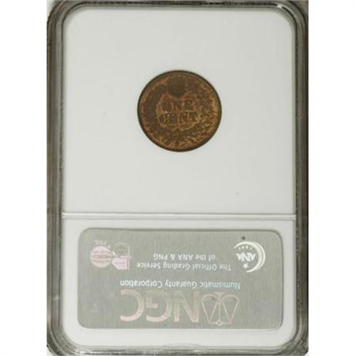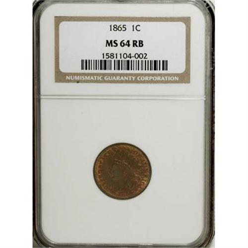 <B>1865 1C Fancy 5 MS64 Red and Brown NGC.</B></I> NGC Census: (170/170). PCGS Population (215/70). Mintage: 35,429,288. Numismedia Wsl. Price for NGC/PCGS coin in MS64: $200. (#2083)<BR><BR><B>Coin Engraver:</B> James B. Longacre<BR><BR><b>Shipping:</b> Coins & Currency (<a target="_blank" href="http://www.heritageauctions.com/common/shipping.php">view shipping information</a>)
