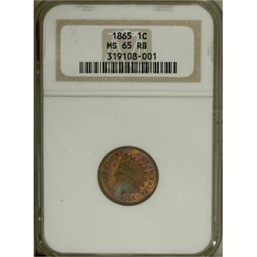<B>1865 1C Fancy 5 MS65 Red and Brown NGC.</B></I> NGC Census: (149/20). PCGS Population (70/3). Mintage: 35,429,288. Numismedia Wsl. Price for NGC/PCGS coin in MS65: $380. (#2083)<BR><BR><B>Coin Engraver:</B> James B. Longacre<BR><BR><b>Shipping:</b> Coins & Currency (<a target="_blank" href="http://www.heritageauctions.com/common/shipping.php">view shipping information</a>)