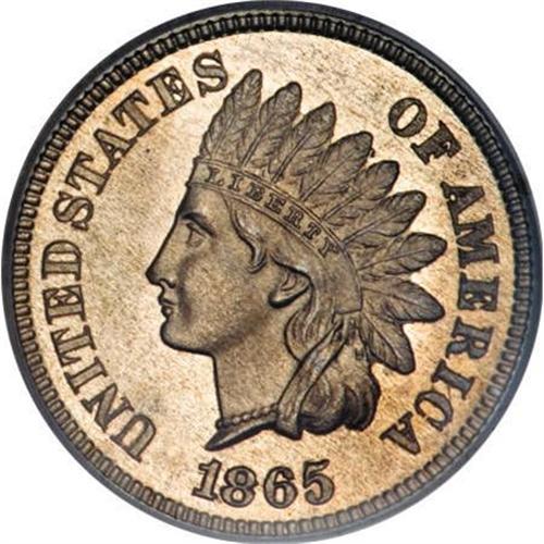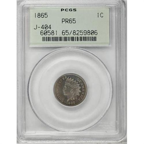 <B>1865 1C One Cent, Judd-404, Pollock-473, Low R.7, PR65 PCGS.</B></I> A regular dies Indian cent struck in the copper-nickel alloy discontinued the previous year. Plain edge. These dies trial pieces are known on both 47-grain and 72-grain planchets, the latter most likely struck on leftover copper-nickel planchets from 1864. In the PCGS encasement, it is impossible to tell which planchet stock was used for this piece. Nicely mirrored, the surfaces retain much of the original "whiteness" of the copper-nickel alloy with slight gray-brown mellowing on each side. The fields show pronounced die striations. An essentially carbon-free example of this rare off-metal striking.<BR><BR><b>Shipping:</b> Coins & Currency (<a target="_blank" href="http://www.heritageauctions.com/common/shipping.php">view shipping information</a>)
