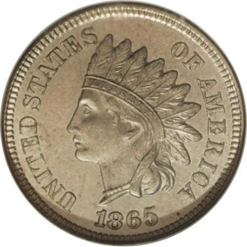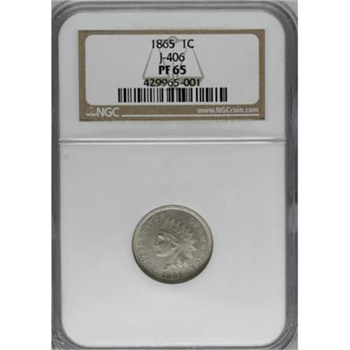 <B>1865 1C One Cent, Judd-406, Pollock-475, Low R.6, PR65 NGC.</B></I> Snow-PT1c Plain 5, obverse die of Snow-1 which exhibits repunching on the 1, 8, and 5 in the date. From regular issue Indian cent dies, but struck in nickel alloy with a plain edge. Rick Snow opines in his recent monograph on 1859-1869 cents that "All examples seen of PT1c nickel alloy are from the regular dies used later on the regular issue Plain 5 S1." A beautifully preserved and crisply struck Gem with faint gold patina, but primarily dazzlingly brilliant. The reverse die is slightly rotated clockwise.<BR><BR><b>Shipping:</b> Coins & Currency (<a target="_blank" href="http://www.heritageauctions.com/common/shipping.php">view shipping information</a>)