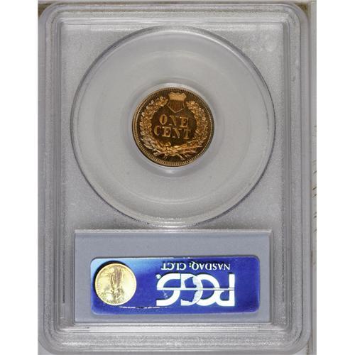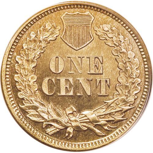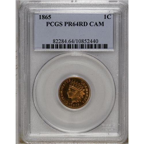 <B>1865 1C PR64 Cameo PCGS.</B></I> Reflective orange-gold surfaces exhibit traces of silver-mauve color along the right obverse and around the reverse borders. Well executed design elements include sharp delineation on the diamonds and headdress feathers. A few light unobtrusive flecks are noted on the obverse. Population: 4 in 64 Cameo, 2 finer (10/06).<BR><BR><b>Shipping:</b> Coin/Currency (<a target="_blank" href="http://www.heritageauctions.com/common/shipping.php">view shipping information</a>)