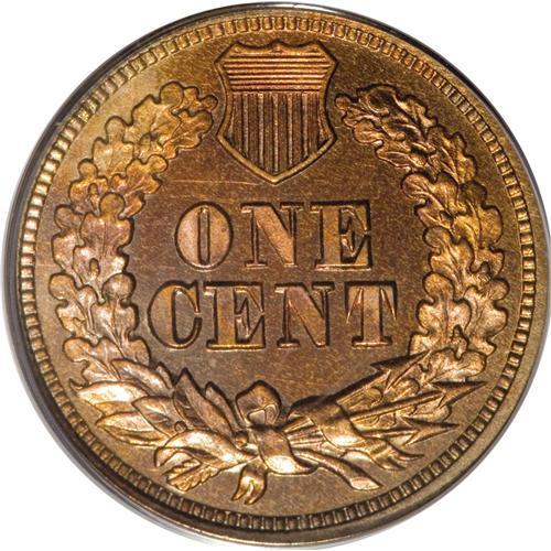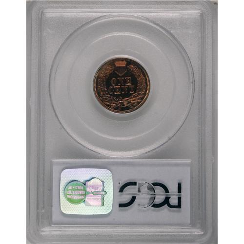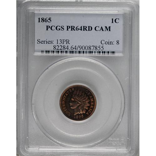 <B>1865 1C PR64 Red Cameo PCGS.</B></I> Plain 5. The brick-red centers are framed by orange-gold. A prominently mirrored Choice cent with exactingly struck devices and attractively preserved fields. A scarce proof date, with a <I>Guide Book</B></I> mintage of 500+ pieces. Population: 4 in 64 Red Cameo, 2 finer (2/07).<BR><BR><b>Shipping:</b> Coins & Currency (<a target="_blank" href="http://www.heritageauctions.com/common/shipping.php">view shipping information</a>)