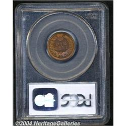 <B>1865<1C> PR64 Red PCGS.</B></I> Plain 5. Snow-PR2. This meticulously struck near-Gem has bright gold color that has mellowed only slightly in lilac hues across portions of the reverse field. A few minute toning flecks accompany the AME in AMERICA, and a few miniscule lintmarks (as produced) are found in the left obverse field. The 1 in the date is lightly repunched north. Population: 16 in 64, 10 finer (7/04). <BR><BR><B>Important notice:</B> Heritage usually auctions material at the rate of 200-250 lots per hour. On some occasions eBay Live bid software or the Internet may not be able to keep up with the pace of the auction. We recommend placing a realistic absentee bid now as insurance to avoid disappointment. Occasionally the auctioneer may eliminate or reject an eBay Live bid, and the auctioneer may also reopen a lot after the close of the eBay live bidding (usually because we missed an audience bid), and may reject your bid even if it shows you as the winning bidder. By bidding via eBay Live, you agree that Heritage may award the lot to another bidder at its sole discretion under the circumstances described above or any other reasonable circumstances. Since eBay bids are not shown to us until we open the lot on the floor, we treat those bids just like floor bids. In most cases the floor responds before the eBay bid is presented to us, due to Internet lag time, so for consistency we have made it a policy that floor bids are always considered first over tie eBay live bids. Also please note that all Heritage lots purchased through eBay Live carry a 20% Buyer's Premium. Please make sure you read the Terms and Conditions before you bid. </span></font></tr></table></td></tr></table>