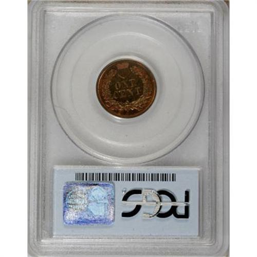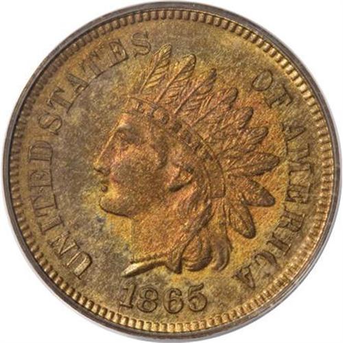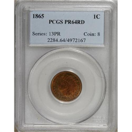 <B>1865 1C PR64 Red PCGS.</B></I> Richard Snow (2006) says of the 1865 proof cent: "This is one of the tougher dates in the early Indian Head series. ... It usually is found with streaky red-brown colors. Full red examples are very hard to locate, especially without spots and problems. Cameos are very rare." The near-Gem in this lot displays gorgeous reddish-gold color imbued with wisps of light green. Excellent definition on the design elements has resulted from a solid strike, and strong contrast is noted when the piece is tilted beneath a light source. Close scrutiny reveals no unsightly spots, stains, or significant contact marks. Population: 16 in 64 Red, 9 finer (6/07).<BR><BR><b>Shipping:</b> Coins & Currency (<a target="_blank" href="http://www.heritageauctions.com/common/shipping.php">view shipping information</a>)